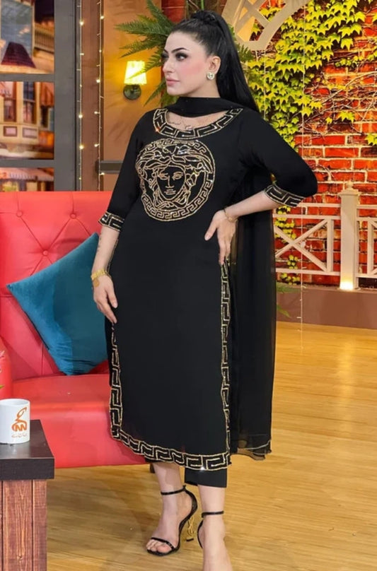 Vrsace - 3PC Unstitched Shamooz Silk Embroidered Shirt with Bamber Chiffon Dupatta and Plain Trousers -ES1060