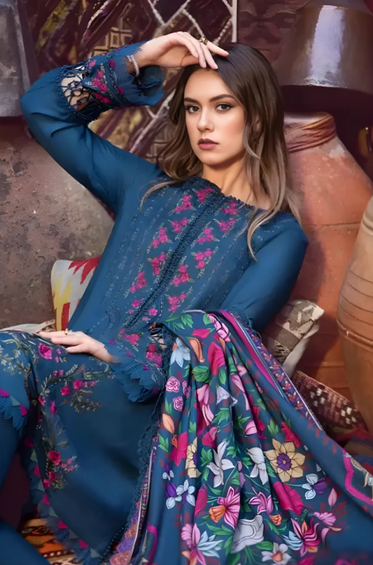 Maria B - 3PC Unstitched Dhanak Embroidered Shirt with Printed Shawl and Trouser - ES1098